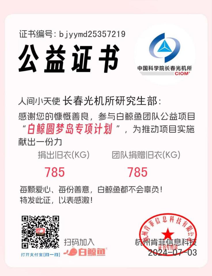 为深入学习贯彻习近平新时代中国特色社会主义思想,发扬新时代雷锋精神,践行勤俭节约理念,弘扬优良传统,传递温暖爱心,长春光机所研究生部党总支于2024年6月组织研究生会、光栅中心学生党支部和空间新技术部学生党支部开展“衣旧传情,让爱永不止步”主题党日活动。 “积土成山,风雨兴焉;积水成渊,蛟龙生焉;积善成德,而神明自得,圣心备焉。”每一份小小的爱心,汇聚成了一次次的善举,传递爱心,分享快乐,人行其善,物尽其用。在研究生部全体师生的爱心捐赠与整理打包下,研究生部与白鲸鱼旧衣回收平台合作,共计捐赠衣物20余箱,合计785公斤的爱心衣物,并获得了白鲸鱼颁发的公益证书。党员同志们以实际行动切实发挥了先锋模范作用,用实际行动传递了互助互爱的能量,营造了温暖和谐的社会环境。 此次“衣旧传情,让爱永不止步”主题党日活动,充分展现了长春光机所研究生部老师同学们的责任和爱心。学生党员们表示,在今后生活中要保持勤俭节约的习惯,继续传承互帮互助的优秀品质,展现新时代长光人的精神风貌。小衣物传温暖,大爱心创和谐。愿这些“爱的礼物”温暖人心,传播正能量!