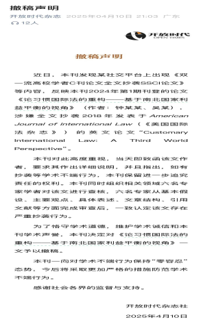 此前,有网友反映,期刊《开放时代》2024年刊发的一篇论文涉嫌大面积翻译抄袭2018年的一篇英文论文。 4月10日晚,开放时代杂志社发布《撤稿声明》称,认定该文存在严重抄袭行为。决定予以撤稿。 同时,开放时代杂志社在评论区称,本刊网站、微信公众号已经撤稿,并要求中国知网等平台撤回该文。