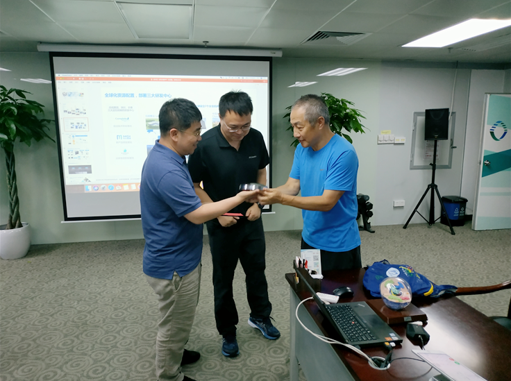 会上,莫成钢代表公司向汪建赠送了公司自主设计加工的光学镜片。