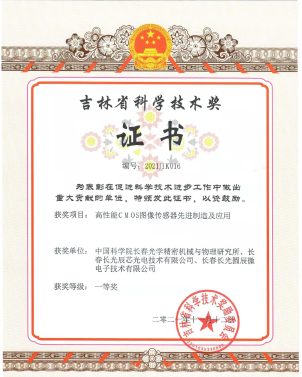 由长春光机所推荐2021年度吉林省科学技术奖项目中,由长春光机所、长春长光辰芯光电技术有限公司、长春长光圆辰微电子技术有限公司共同申报的《高性能CMOS图像传感器先进制造及应用》项目于2021年11月12日被吉林省授予吉林省科学技术奖一等奖。