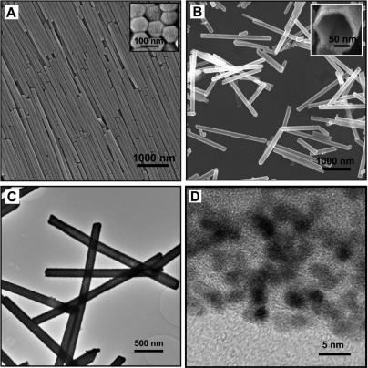 图 2. 卟啉纳米线模板电镜图片(A)和中空的六边形铂纳米管电镜照片(B和C)及其铂纳米粒子高分辨透射电镜照片(D)