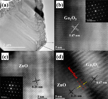 氧化锌/氧化镓核壳结构微米线采用一步CVD生长法制备。这种方法所生长的核壳结构微米线,核层氧化锌和壳层氧化镓都是高晶体质量的单晶,并且两种材料的界面非常陡峭,无明显界面缺陷和位错的存在。通过在核层与核层分别制备金属电极,就构成了异质结结构的日盲紫外探测器件。器件的响应峰值在254 nm,响应截至边266nm,对日盲紫外光具有高灵敏度、高探测度、高量子效率和高速的响应。-6 V的电压驱动下,器件的明暗电流比可以达到106以上,响应度可达到1.3×103 A/W, 探测率为9.91×1014 cm·Hz1/2/W,响应时间小于20 μs,该结果为目前同类器件当中性能最好的结果,其主要性能高于目前商业Si雪崩二极管。通过对器件的性能进行了深入的研究,发现器件具有雪崩增益,其增益高达104