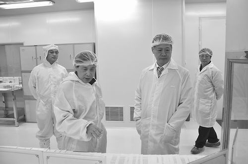 王立军院士(左一)与英国曼彻斯特大学教授李林参观实验室。