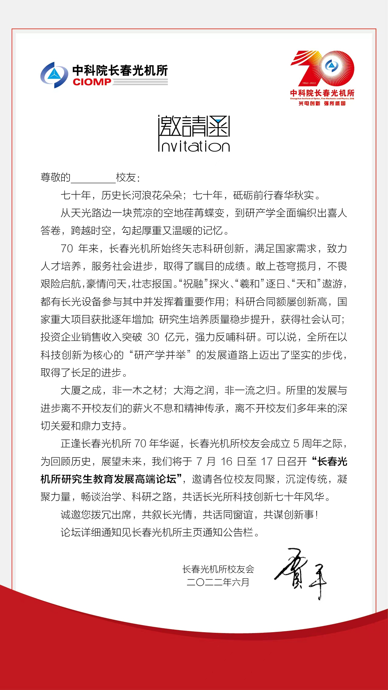 欣逢长春光机所建所70周年,长春光机所校友会成立5周年之际,为回顾历史,展望未来,加强校友与长春光机所的沟通、交流与合作,长春光机所将举办以校友为主要代表的研究生教育发展高端论坛。举办时间拟定于2022年7月16日-7月17日,诚邀各位校友拨冗出席,共叙长光情,共话同窗谊,共谋创新事!