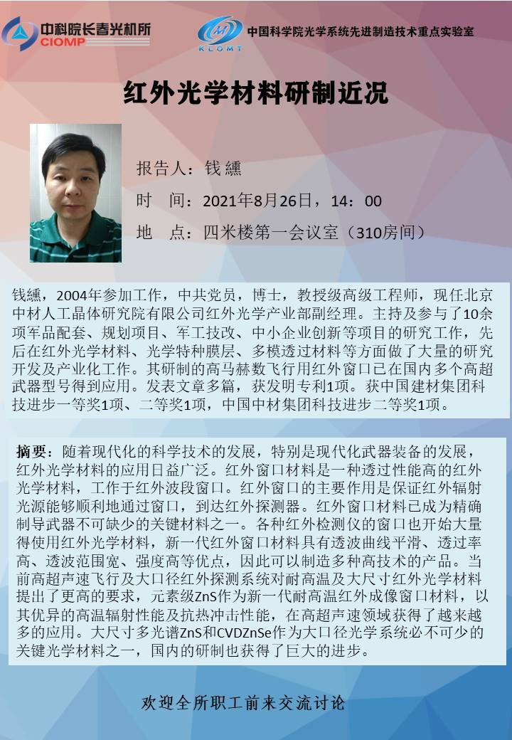 报告人简介:钱纁,2004年参加工作,中共党员,博士,教授级高级工程师,现任北京中材人工晶体研究院有限公司红外光学产业部副经理。主持及参与了10余项军品配套、规划项目、军工技改、中小企业创新等项目的研究工作,先后在红外光学材料、光学特种膜层、多模透过材料等方面做了大量的研究开发及产业化工作。其研制的高马赫数飞行用红外窗口已在国内多个高超武器型号得到应用。发表文章多篇,获发明专利1项。获中国建材集团科技进步一等奖1项、二等奖1项,中国中材集团科技进步二等奖1项。
