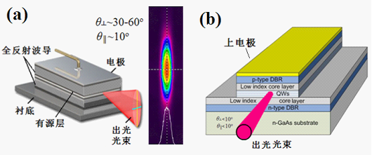 一直以来,半导体激光器的最大缺点之一是它较大的发散角,以及椭圆形出光光斑,这导致较差的光束质量。而光束质量反映的是激光的可汇聚性,直接影响到实际应用。目前商业化的半导体激光器均采用全反射波导结构(如图1(a)),该结构的激光谐振腔狭小,不对称,导致快轴发散角高达30o-60o,慢轴发散角10o。