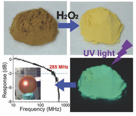 曲松楠课题组利用过氧化氢溶液对以柠檬酸与尿素为原材料,微波法合成的原本固态荧光猝灭的碳纳米点进行氧化处理,该方法不同于被较多报道的将碳纳米点掺杂进入例如PVA或无机盐等基质的方法,处理后的碳点获得宽带隙的表面能级结构,抑制了碳纳米点聚集态下表面态的无辐射跃迁过程,获得固态下荧光量子效率25%的黄绿光碳纳米点。以所研制的碳纳米点荧光粉作为颜色转换层,通过调节碳点荧光粉的比例,制备出不同色温的白光LEDs。所研制的碳点荧光荧光寿命只有几个纳秒(~ 6ns),将其作为光转换层,制备可见光通信领域器件,国际上首次实现了带宽为285MHz 、信号传输速率为435 Mbps的基于碳纳米点的可见光通信。