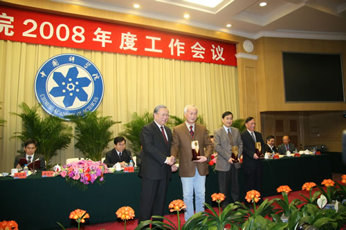 在3月26日下午闭幕的中国科学院2008年度工作会议上,全国人大常委会副委员长、中国科学院院长路甬祥向获得2007年中国科学院杰出科技成就奖的个人和集体颁发了奖章和奖杯。