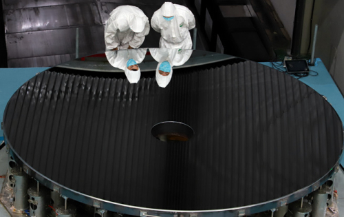 工作人员正在检查4米口径高精度碳化硅非球面反射镜。(张译心摄)