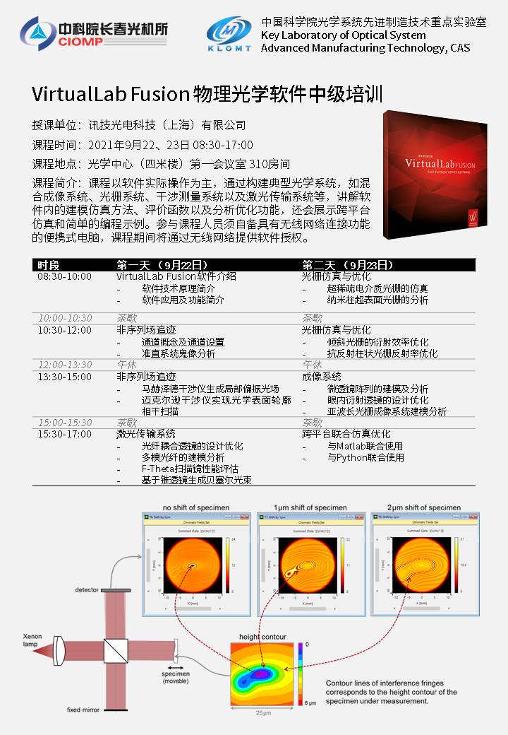 课程简介:课程以软件实际操作为主,通过构建典型光学系统,如混合成像系统、光栅系统、干涉测量系统以及激光传输系统等,讲解软件内的建模仿真方法、评价函数以及分析优化功能,还会展示跨平台仿真和简单的编程示例。参与课程人员须自备具有无线网络连接功能的便携式电脑,课程期间将通过无线网络提供软件授权。