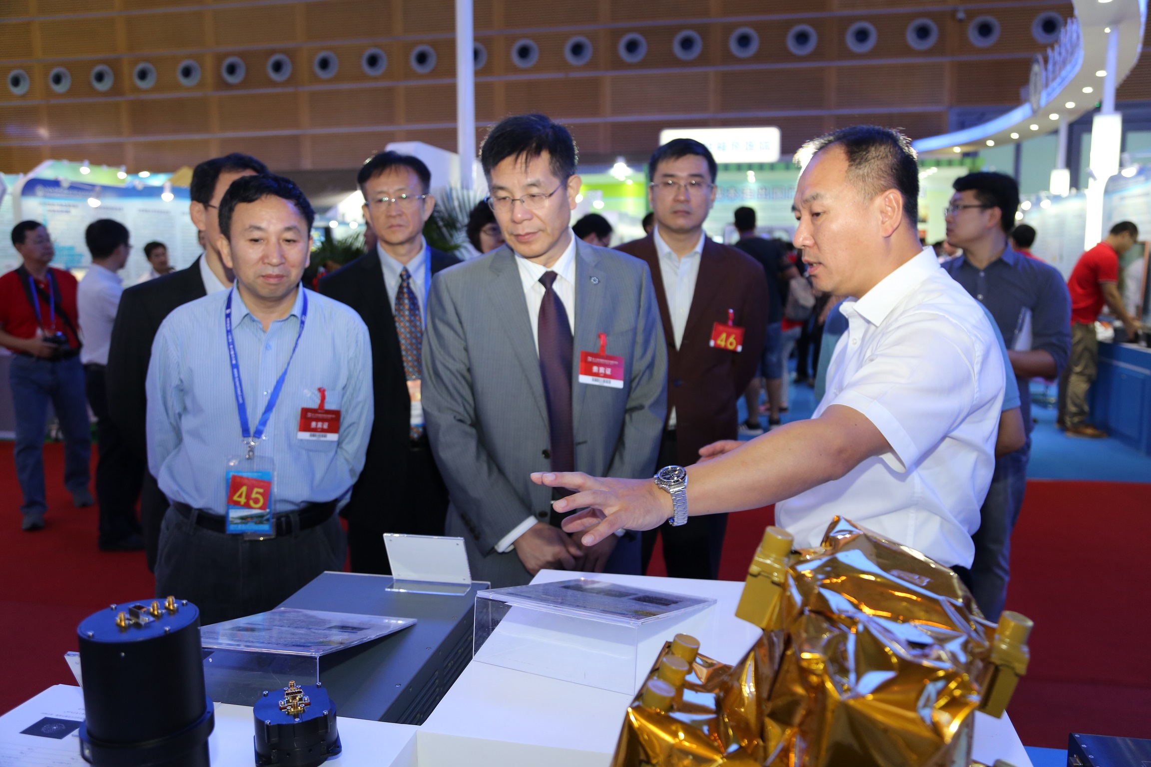 中科院秘书长邓麦村(中)、中科院长春分院党组书记甘建国(左一)到长春光机所展区观看科研成果