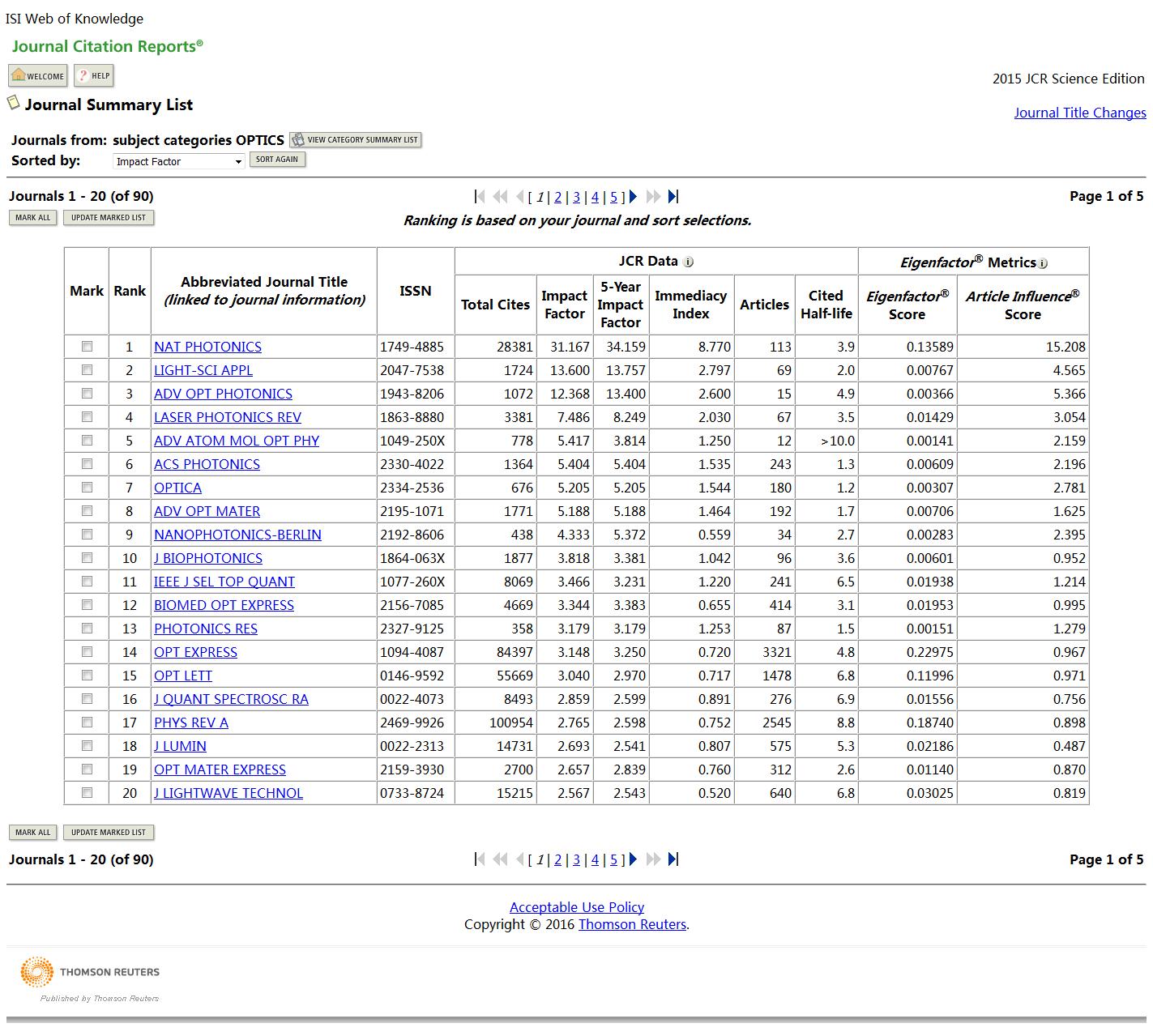 费城时间2016613日,汤森路透集团发布了2016年科技期刊引证报告(JCR 2015),Light: Science & Applications(《光:科学与应用》,以下简称Light)获得了它自创刊以来的第三个影响因子:13.6,在JCR收录的90种光学类期刊中排名第2位,这也是Light连续第二年在SCI收录的光学类期刊中排名第2位。相较于2015年汤森路透集团发布的科技期刊引证报告(JCR 2014),SCI收录的光学类期刊总数从86种增加至90种,Light年度发文量攀升30%,总被引频次增长率更高达65%Light在保持自身高端品牌的同时,也在快速扩大自身的影响力。