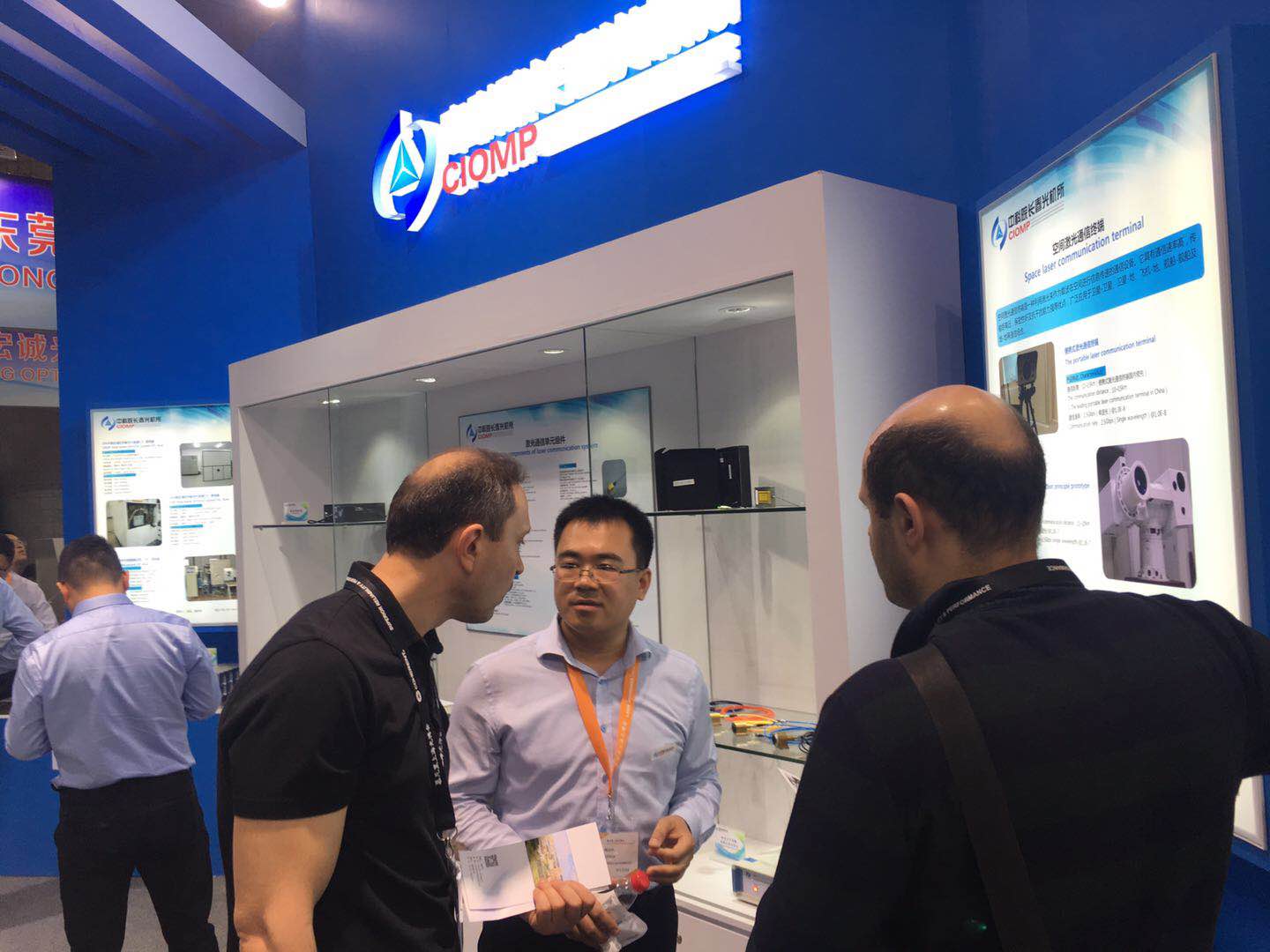 展会期间,我所集中展示了2米口径碳化硅反射镜、高精度衍射光栅、1KW与10KW脉冲激光器、中红外脉冲大能量氟化氘(DF)激光器、便携式激光通信终端、舰载激光通信终端、小型化双波长宽温中红外激光器、超轻质碳纤维复合材料反射镜、高灵敏度EMCCD相机、轻小型高精度星敏感器、微型光谱仪、星载激光通信终端、大行程快速偏转镜等系列科技成果和转化产品。展台前,吸引了大批展商和观众驻足了解情况,来自德国、巴基斯坦等国家和地区的激光专家与我所科研人员进行了现场交流。