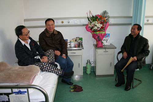 上午9点30分,贾平书记首先来到吉林省医院,看望了因病住院的老红军、现年96岁的离休干部李光。一进病房,贾平就紧紧握住李光的手,关切地询问李光的生活起居和身体健康状况,并衷心祝愿他早日康复!贾平向李光简要通报了长春光机所的发展状况,希望他继续关心、支持研究所的发展,为长春光机所的改革、建设与发展献计献策,发挥余热。