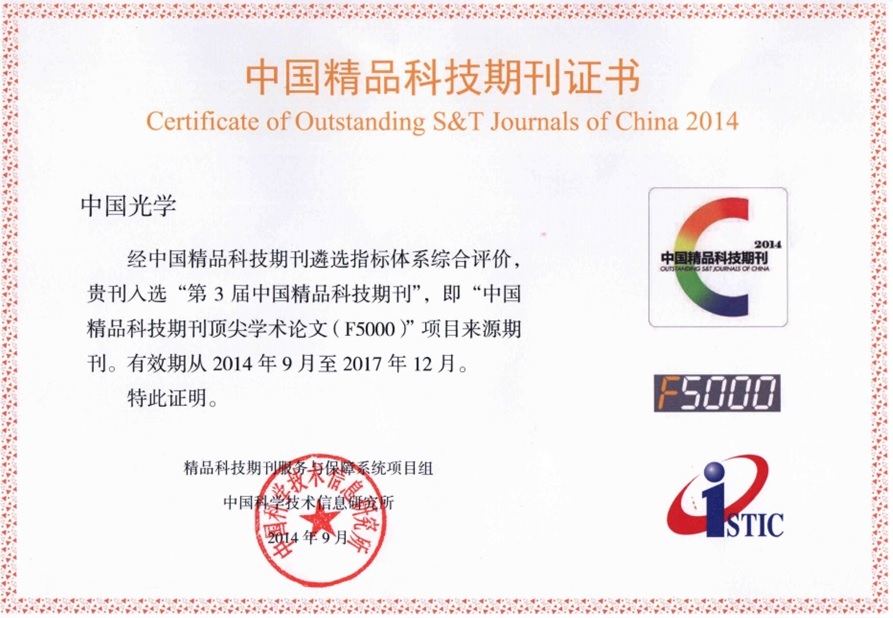 《中国光学》于2008年底创刊,本次入选“中国精品科技期刊”,标志着该刊在2011年入选“中国光学学会一级会刊”,2012年被全球著名学术出版商Elsevier公司Scopus数据库收录,2013年入选“中国科技核心期刊”之后取得的跨越式进步,彰显了《中国光学》学术水平、办刊水平和影响力的提升,同时表明该刊具有一定的发展潜力。