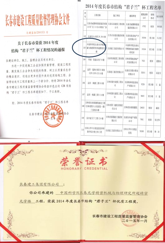 超精密光学楼获得结构“君子兰”杯优质工程奖