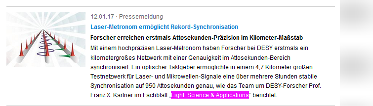 近日,世界著名的高能物理和加速器技术研究机构——德国电子同步加速器国家实验室官方网站头条报道了《Light: Science & Applications》的文章Light: Science & Applications (2017) 6, e16187; doi:10.1038/lsa.2016.187:Attosecond precision multi-kilometer laser-microwave network(http://www.nature.com/lsa/journal/v6/n1/full/lsa2016187a.html)。