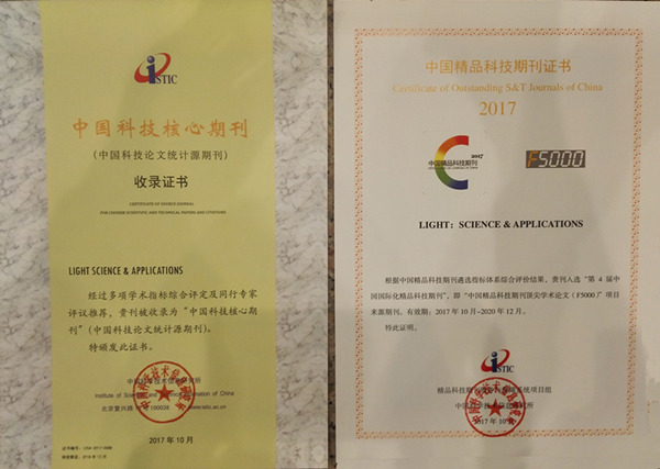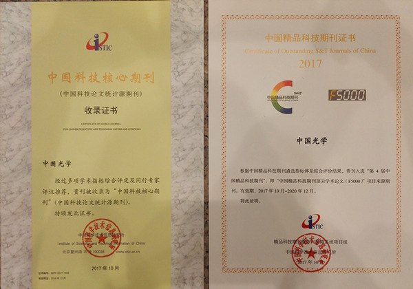 长春光机所主办的五种期刊成果丰硕。五种期刊全部进入《2017年版中国科技期刊引证报告(核心版)》,成为中国科技论文统计源期刊。其中Light:Science & Applications、《光学精密工程》、《中国光学》获得“第四届中国精品科技期刊”即“中国精品科技期刊顶尖学术论文(F5000)”项目来源期刊。《中国光学》和《发光学报》分别有2篇和1篇论文被评选为“中国百篇最具影响国内学术论文”。《中国光学》影响因子1.821,再次位列物理学类(37种)和光电子学与激光技术类(27种)期刊第1名。