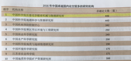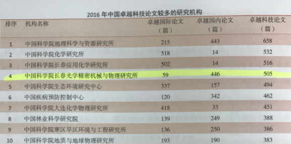 据中国科学技术信息研究所(简称中信所)2017年10月31日发布的《2017中国科技论文统计结果》之“中国卓越科技论文产出状况报告”,长春光机所在研究机构中产出“2016年中国卓越国内科技论文”最多(见图1)。
