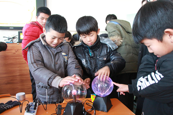上午九点钟活动准时开始,两名主讲人先后介绍了光学及电学的基本知识,内容包括光的直线传播、光的反射、光的折射、电的简单认识、常见发电方式、安全用电,串并联电路以及发电机原理等,同时播放了 “震撼的手影绘世界”视频短片。课上孩子们认真听讲,积极回答问题。在演示实验环节,孩子们积极动手,自己组装实验器材并进行实验演示,包括光学器材、电学器材和辉光球。孩子们自己动手演示光的直线传播、光的反射、光的折射、串并联电路、手摇发电机,认识三棱镜、凹透镜、凸透镜、指南针。在科普提问环节,孩子们积极踊跃参加答题,对回答问题的孩子进行玩具奖励。活动结束后为每一个孩子赠送了一本《七彩的光学》科普书籍,整个科普活动进行了约40分钟。