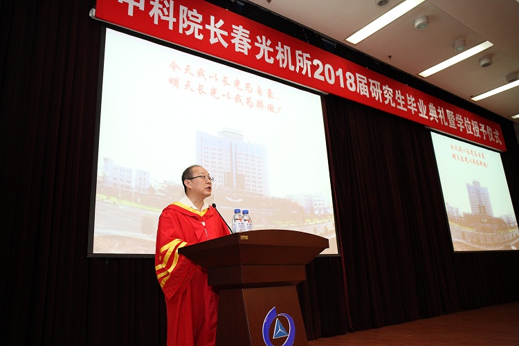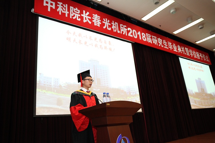 9时,毕业典礼在庄严的国歌声中正式开始。张涛副所长代表长春光机所向即将步入崭新舞台的毕业生表示祝贺,代表我所全体教职员工向全体毕业生致以衷心祝贺,向为同学们圆满完成学业而辛勤付出的师长、亲友们表示诚挚感谢。张涛副所长满怀深情,语重心长的回顾了近几年来我所在教学科研、人才培养、国际交流、服务社会等方面都取得成果,与全体毕业生一同品味、共勉成长。