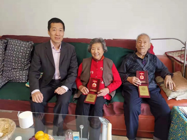 在喜迎中华人民共和国成立70周年之际,根据中组部、中科院通知精神,9月20日上午,长春光机所党委书记、副所长马明亚在离退中心主任韩文斌的陪同下,登门看望慰问了离休干部、原物理所党委副书记刘权。马明亚详细了解了刘权的生活起居状况,嘱咐他保重身体,祝福他健康长寿。马明亚对刘老为党和国家的事业及本所的建设发展做出的巨大贡献表示衷心感谢,并转交了中共中央、国务院、中央军委颁发的庆祝中华人民共和国成立70周年纪念章。当了解到刘老的夫人也为离休干部并荣获庆祝中华人民共和国成立70周年纪念章时,马明亚向二位老人表达了诚挚的祝福,并高兴地与二位老人合影留念。