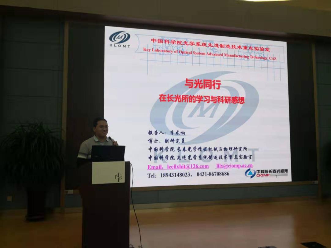 首先,光学技术中心精度复杂曲面光学系统制造研究室副主任李龙响为同学们带来了《与光同行——在长光所的学习与科研感想》报告。从本科求学,到来到长春光机所硕博连读、攻读学位,再到选择留所从事科研工作,李龙响满怀真情实感的向同学们讲述自己经历、体会,不仅把生活、学习、做科研、求职的很多经验与大家分享,更鼓励同学积极有为、树立目标,以乐观向上的态度度过一个充实的研究生生活。