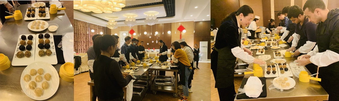 活动在长春光机所专家公寓二楼自助餐厅举行,公寓的工作人员已经提前将包月饼的工具、材料准备齐全,大家到达现场后都迫不及待地系上围裙、戴上护袖。在老师的讲解与指导下,学习老师包月饼的手法并不断地向老师请教问题。在月饼烘烤期间,国际合作处副处长王卉向外籍专家讲述中秋节的来源、习俗以及祝福语等,并感谢大家在疫情期间坚守科研岗位努力工作。大家纷纷表示,中华文化博大精深,希望日后能够多多举办此类活动,并向所有参与活动准备的工作人员致谢。