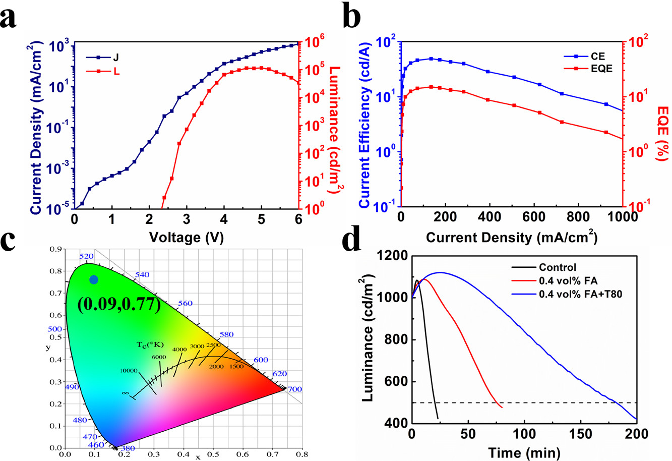 针对这一问题,中国科学院长春光学精密机械与物理研究所发光学及应用国家重点实验室的郭晓阳、吕营和刘星元研究团队采用甲酰胺掺杂PEDOT:PSS诱导钙钛矿结晶,提高钙钛矿薄膜的结晶性。同时使用吐温80作为钙钛矿薄膜的钝化剂,有效减少钙钛矿薄膜的缺陷态。获得了结晶取向度好、荧光量子效率高、晶粒尺寸均匀的高质量全无机钙钛矿发光薄膜。在甲酰胺界面处理和吐温80钝化处理的协同作用下,制备的全无机钙钛矿发光二极管外量子效率为15.02%,器件的最大亮度达到了185000 cd/m2,在初始亮度为1000 cd/m2时,器件的运行寿命为182.5分钟。这是目前已报道的全无机钙钛矿发光二极管中性能最好的器件之一。