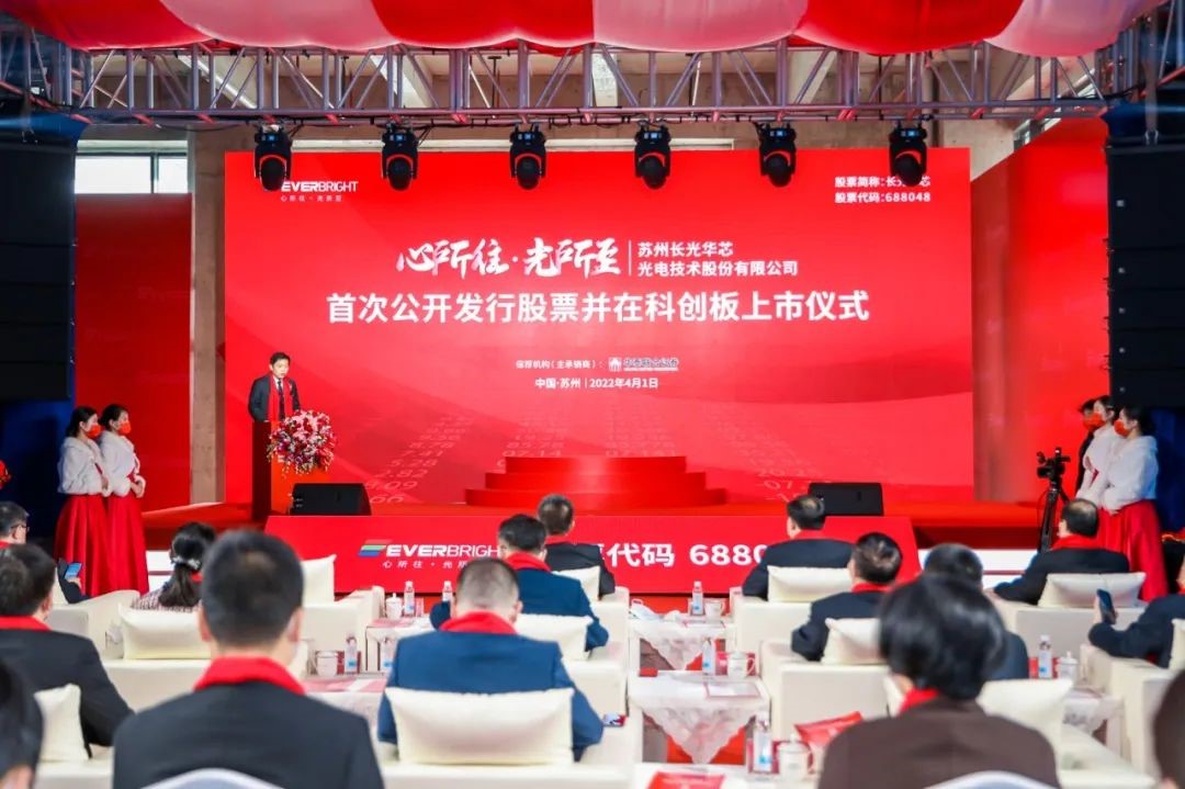 2022年4月1日,长光集团持股企业苏州长光华芯光电技术股份有限公司于上海证券交易所科创板上市,成为科创板半导体激光芯片第一股,股票代码:688048,发行价格:80.80元/股。此次公开发行是长光华芯发展史上的里程碑时刻,长光华芯也成为我所产业系统第二家登陆资本市场的企业。