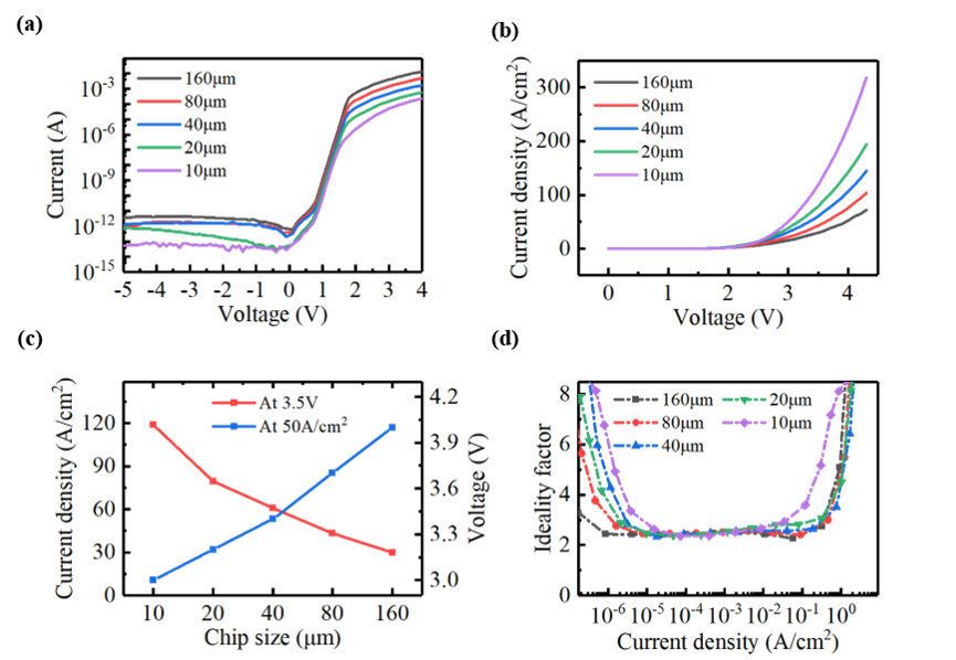 (c)电压和电流密度与芯片尺寸的关系;(d)不同芯片尺寸下理想系数对电流密度的影响