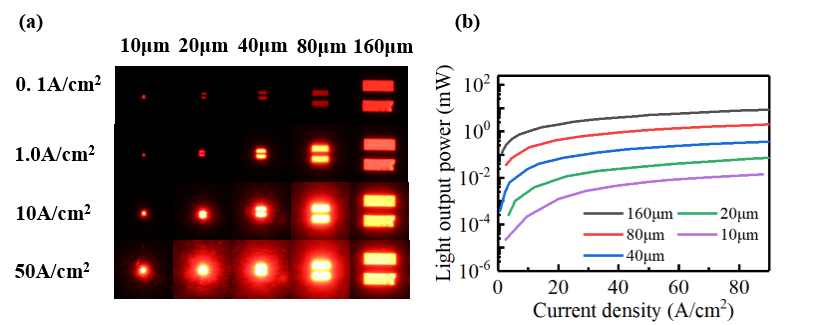 图3 (a)不同尺寸Micro-LED的电致发光图像;(b)不同芯片尺寸的光输出功率特性
