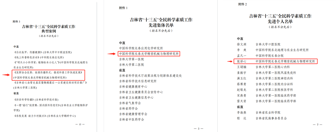 近日,吉林省科协印发了《关于表彰吉林省“十三五”全民科学素质工作先进典型的决定》,长春光机所荣获“全民科学素质工作先进集体”称号,我所《发挥协会优势,拓展传播形式,推进科普工作快速发展》的事迹材料荣获“全民科学素质工作典型案例”,长春光机所党委办公室张译心荣获“吉林省全民科学素质工作先进个人”称号。