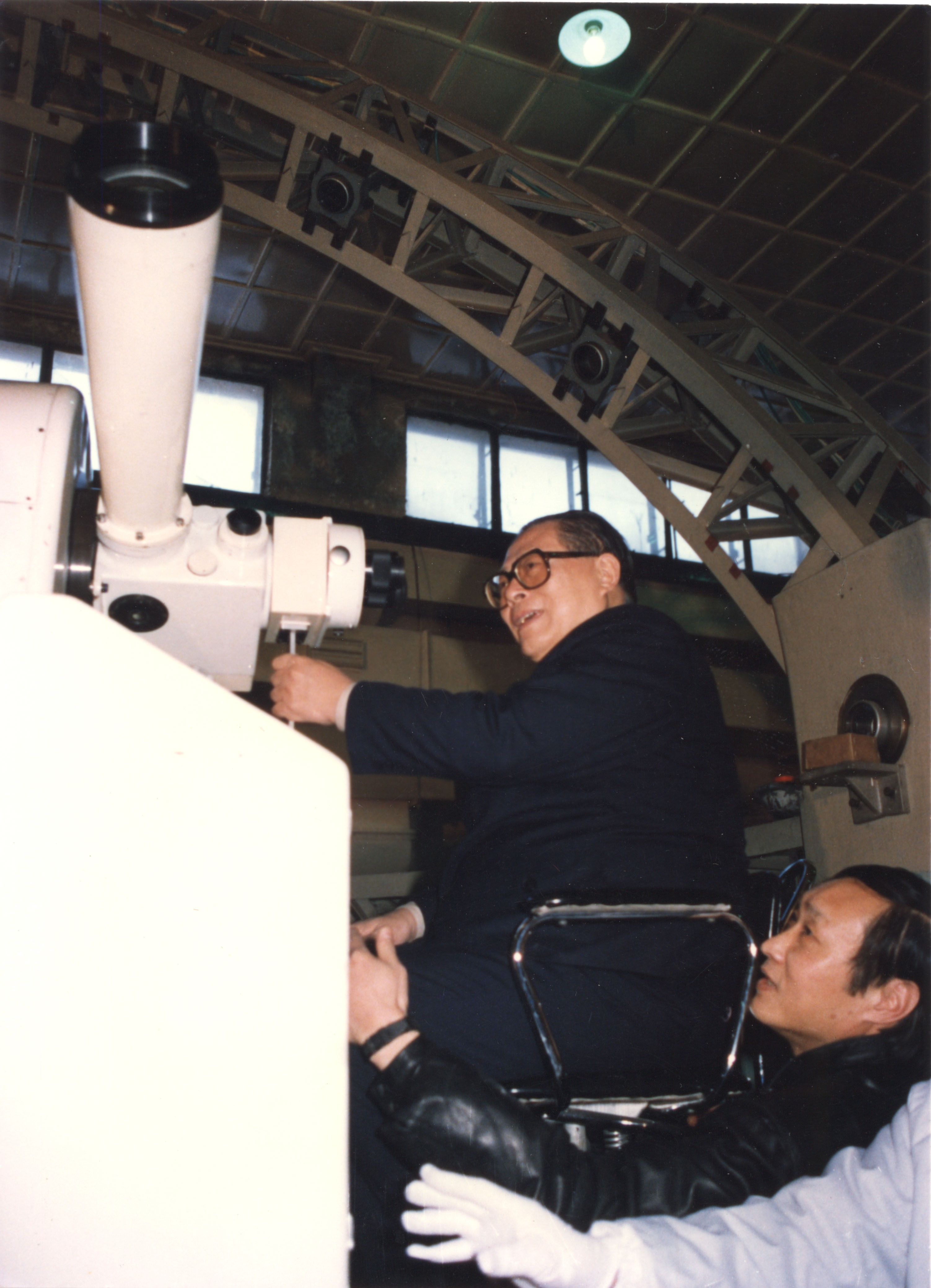 1991年1月12日,江泽民同志在长春光机所兴致勃勃地登上662跟踪经纬仪操作台。