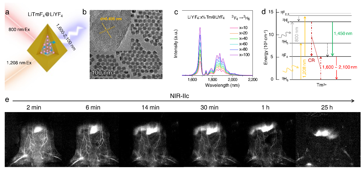 稀土离子掺杂的纳米材料具有丰富的电子跃迁能级,发光谱带多样,发光峰窄,(反)斯托克斯位移大,光化学性质稳定,易于表面功能化修饰等优点,已成为理想的NIR-II成像探针,在多路传感、时间门控检测、成像引导治疗和手术中具有巨大的应用潜力。针对当前荧光成像领域存在的问题和对于长波长荧光探针的迫切需求,该研究提出了通过纳米结构设计加强高掺Tm3+离子相互作用策略,实现高效的NIR-IIc荧光发射的思路。迄今为止,Tm3+3F43H6能级跃迁产生~1800nm荧光发射主要用作块状的激光增益材料。然而,目前还没有关于在NIR IIbc区域使用Tm3+发射在胶体系统实施体内生物成像的报告。这可能是由于严重的浓度和表面淬火效应的限制。而传统的Yb/Tm共掺上转换纳米发光体系,为了避免Tm3+交叉弛豫过程,Tm3+的掺杂浓度一般很低(<1%),同时,Yb3+Tm3+的反向能量传递损耗了大量能量,使Tm3+下移发光很弱。本工作通过外延光学惰性壳层有效避免了激发态能量在纳米粒子表面猝灭,并利用Tm3+之间的交叉弛豫过程实现了高效的NIR-II荧光发射(QY=~14%)。此外,通过掺杂少量Er3+,进一步提高了NIR-II发光强度。若进一步提高Er3+浓度至30%,可以使得这种“合金”结构纳米粒子可以响应四种波长分别激发(800nm980nm1208nm1530nm),为光学保密编码、活体成像提供了强有力的研究工具。