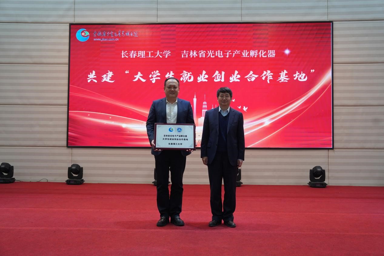 为深入贯彻党中央、国务院“稳就业”“保就业”决策部署,落实景俊海书记“创业奋斗‘就’在吉林”全省大学生创业就业座谈会讲话精神,4月18日上午,长春理工大学与吉林省光电子产业孵化器(以下简称:光电子孵化器)校企联动,共建“大学生就业创业合作基地”揭牌仪式,在光电子孵化器报告厅举行。吉林省教育厅一级巡视员许世彬、长春理工大学校长杨华民、长春理工大学党委副书记刘瑛、光电子孵化器总经理赵嵩等出席仪式。