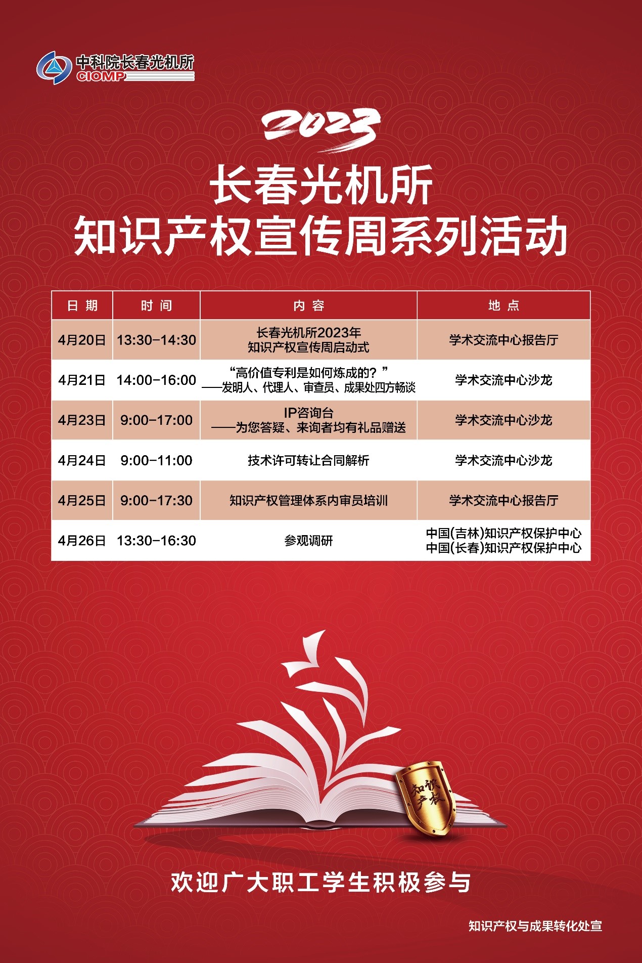 长春光机所成果转化处将举办系列宣传活动,涉及专利申请全周期、法律咨询、许可转让、内审员培训以及参观调研等,诚邀全所职工和学生参与。
