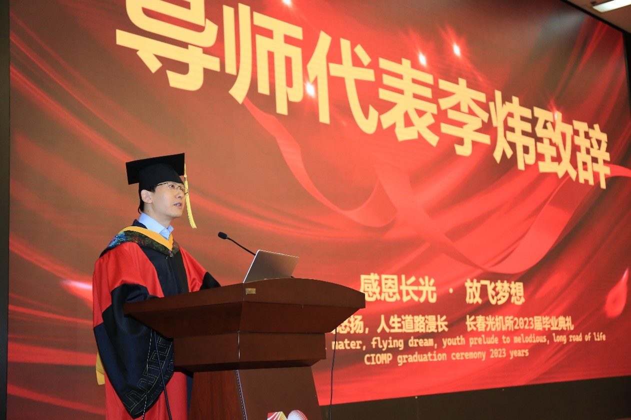 李炜研究员作为导师代表致辞。他讲述了自己对导师身份的理解,对科研工作的热爱,并真诚的祝愿每一位同学都能在未来的人生之路找到自己热爱的事业,收获真正的成就,做一个对自己对家庭负责的人,做一个对社会对国家有用的人,无悔于自己的人生。