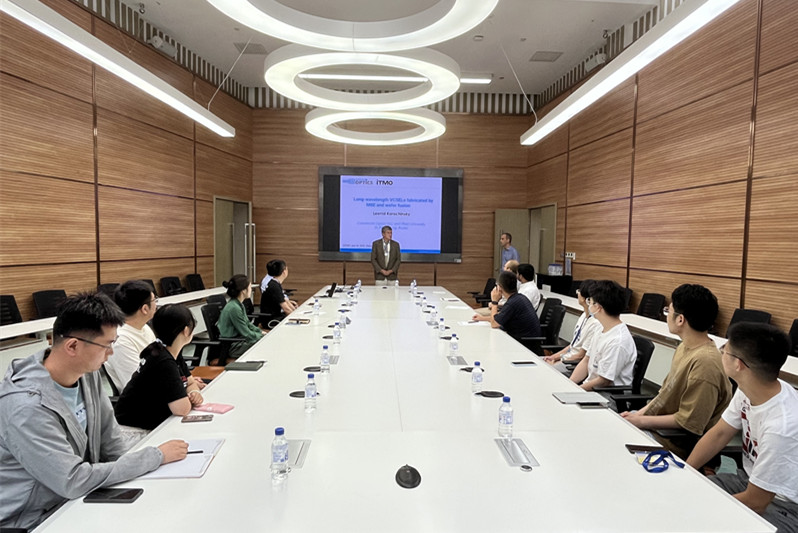 访问期间,Leonid Karachinsky教授在学术交流中心为长春光机所职工和学生做了题为“Long-wavelength VCSELs fabricated by MBE and wafer fusion”的学术报告。报告会由Bimberg中德绿色光子学研究中心、吉林省光学学会共同主办,中德中心主任 Dieter Bimberg主持会议。在报告中,Leonid Karachinsky详细介绍了系列高速长波长垂直腔面发射激光器(VCSEL)创新工作,并就双方合作成果展开了详细介绍。经过前期在高速长波长VCSEL的合作研究,目前已实现基于晶圆熔合技术的1550nm VCSEL创纪录的37Gb/s的传输速率,发表多篇文章。在互动环节中,参会人员踊跃提问,就相关科学问题进行了深入的探讨,拓展了研究生的国际视野,为从事VCSEL领域的的职工和学生搭建了交流学习、展示成果的平台。