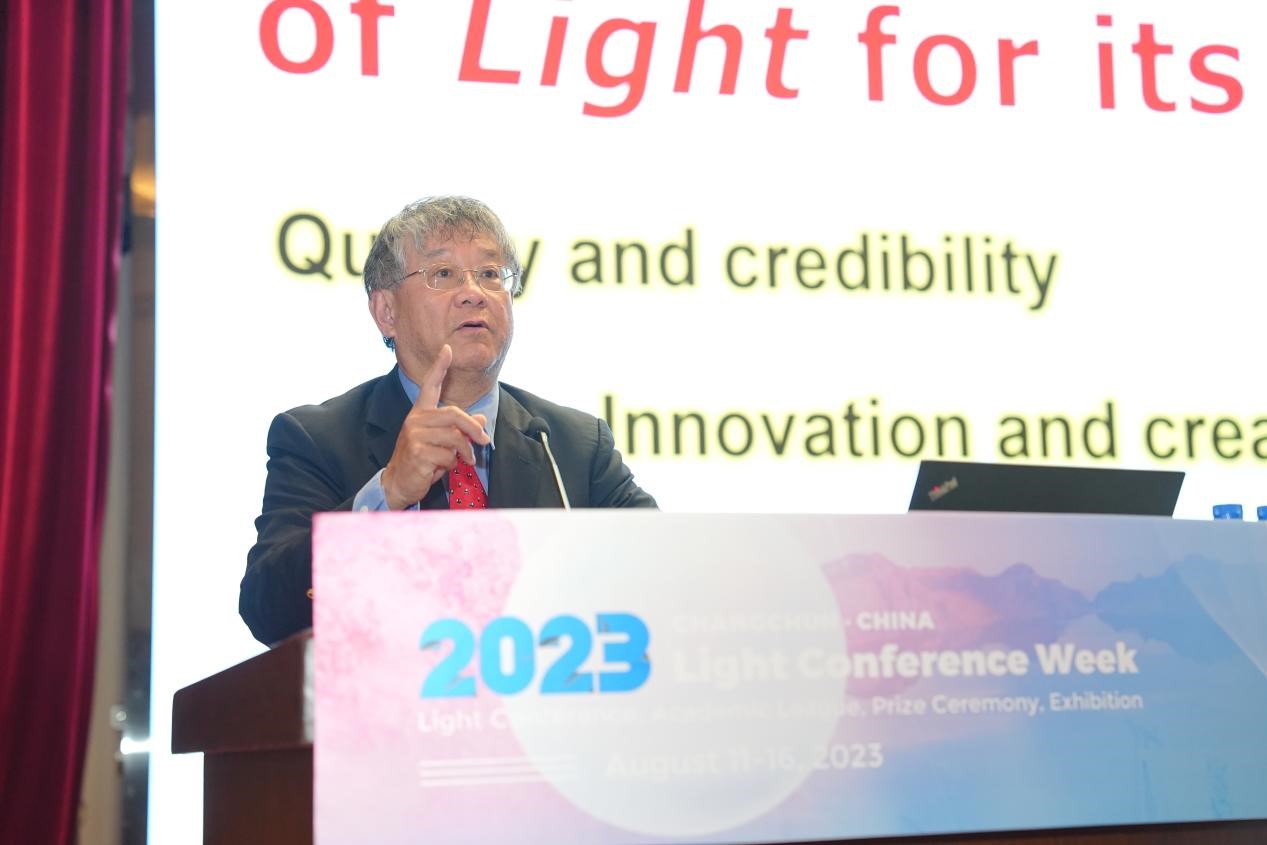 大会由长春光机所副所长张学军主持。开幕式上,长春光机所所长贾平代表主办单位致欢迎辞,他首先感谢与会嘉宾的到来,以及对长春光机所与Light Conference Week 2023的支持。长春光机所被誉为“中国光学的摇篮”,不仅致力于推动光学技术的创新,也积极促进学术交流与合作,与全球光学界共同探索光学发展的未来,并希望通过本次会议与大家开展国际合作项目,培养创新伙伴关系,共同促进光学事业的蓬勃发展。英国牛津大学教授、大会共主席Martin Booth代表大会组委会欢迎各位莅临Light盛会。大会涵盖了激光制造与加工微纳光子学光学成像与计量等多个主题,吸引了来自13个国家和地区的500会者旨在促进光科学与技术领域的研究与发展Light不仅具有科学意义,还象征着知识和智慧的传播。他希望本次大会能成为与会者进行学术交流和思想碰撞的平台,从而推动光科学和技术的进步像光一样照亮人类发展道路。吉林省人力资源和社会保障厅党组成员、副厅长黄明代表吉林省人力资源和社会保障厅向来自海内外的专家学者致以诚挚的问候。他高度肯定了长春光机所为吉林省光电子产业作出的巨大贡献,并表示吉林省人社厅将进一步落实人才强省战略,营造海百川引人才的良好氛围希望通过本次大会宣传吉林推介吉林,吸引海内外更多人才吉林这片沃土上创新、创业、创造。科技部原副部长、Light主编曹健林代表Light感谢大家多年来对Light成长的关注与支持。他指出Light的成功主要归功于全体主编、编委和编辑部同仁们的不懈努力、广大科学家的支持与厚爱、以及依托单位和各级政府的鼎力支持。Light一直都在走一条有自己特色的发展之路。曹健林主编清楚地记得在2008年北京奥运会期间作为奥运会火炬手,参加了长春市的火炬交接仪式,当时高朋满座、胜友如云的北京奥运会激发了他和同事们用奥运精神办国际期刊的想法。在开幕式上,曹健林主编以奥运火炬的形式把他当年的光荣传给北京大学肖云峰教授,邀请肖教授接任他本人成为Light共主编,期待他接过这个火炬,以薪火传承的精神,携手共主编俄罗斯科学院外籍院士、美国罗切斯特大学张希成教授等各方专家与Light一起勇毅前行。同时,曹健林主编也将作为荣誉主编,继续参与Light的工作,希望Light品牌期刊的发展秉承奥运精神:更高(品牌知名度)、更快(发表速度)、更强(影响力)。