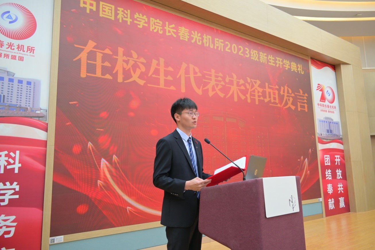 2023级光学工程专业刘源同学作为新生代表,分享了他成功“续约”长春光机所这座光学摇篮,开启人生新旅程后的所思所想。他说,这将是一段充满“大爱”的旅程、坚定“探索”的旅程、矢志“担当”的旅程,号召全体新生以“大爱”为指引,以“探索”为根基,以“担当”为使命,共同书写一段绚丽的研途华章。