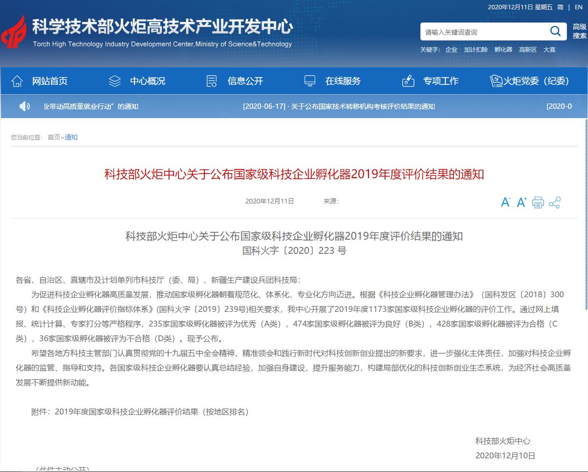 继获批2020中国百家特色载体后,12月10日,科技部火炬中心《关于公布国家级科技企业孵化器2019年度评价结果的通知》国科火字〔2020〕223 号,全国1173家国家级科技企业孵化器参加考核评价,通过网上填报、专家评审、统计计算等严格程序,有235家国家级孵化器被评为优秀(A类),吉林省光电子产业孵化器再获国家A类殊荣。