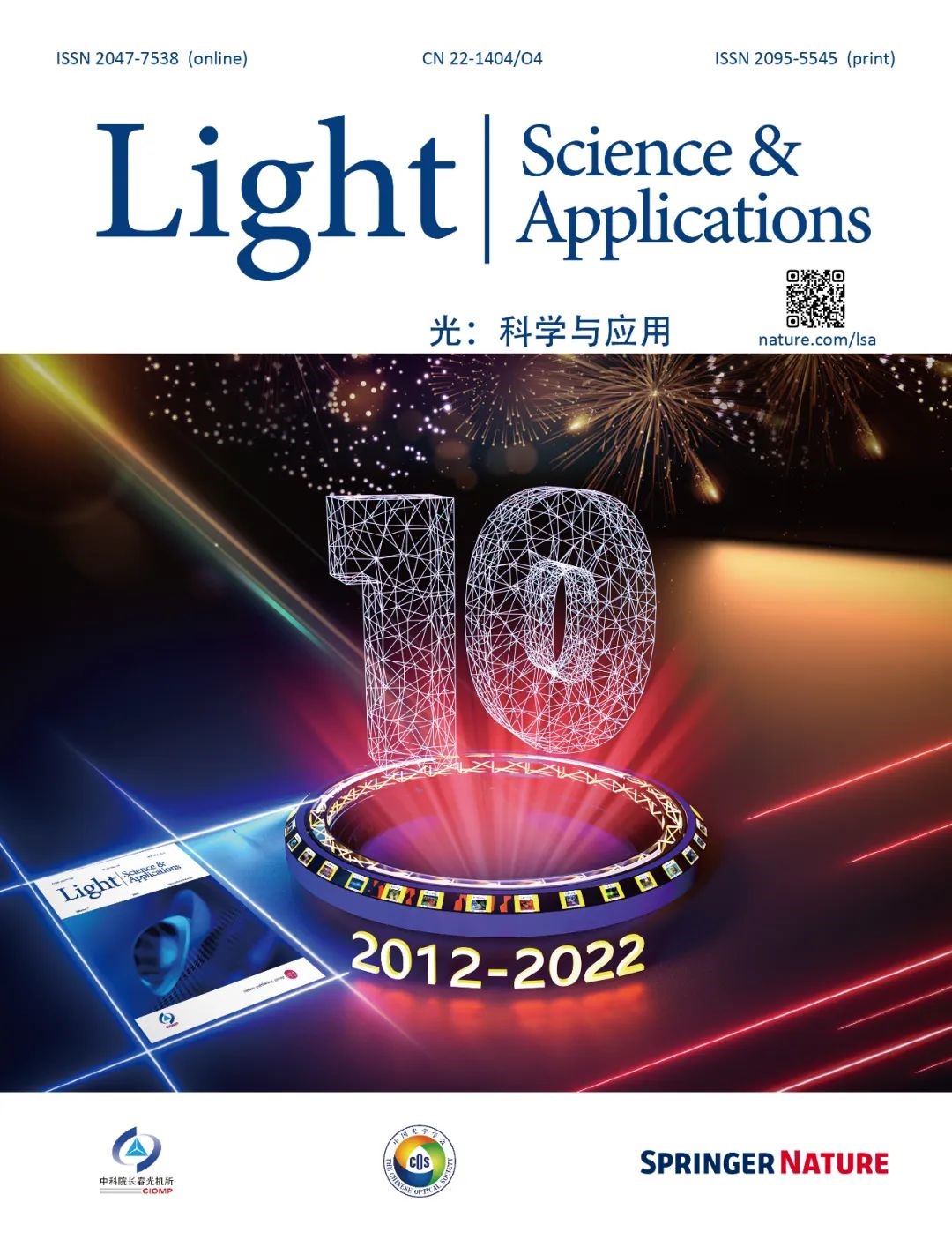 最后,我要特别感谢Light的主办单位中国科学院长春光学精密机械与物理研究所。作为中国最大的光学光电子学研发机构之一,该所的主要业务是工程与应用研发,数千员工中与Light发表论文内容直接相关的不多,能发表Light论文的则更少,但大家都支持Light,以Light为荣。我也要特别感谢忠实的合作者Springer Nature(原自然出版集团),感谢他们打破束缚,与主办单位合作创办Light。没有双方的精诚合作和共同努力,既不会有十年前Light的诞生,也不会有今天Light的成功。作为主编,我还要特别感谢Light编辑部的全体同仁,尤其是那些青年编辑们。正是由于他(她)们的无私奉献和热情服务,Light才能够在科学与技术的海洋中平稳启航,坚定地驶向广阔无垠的未来。