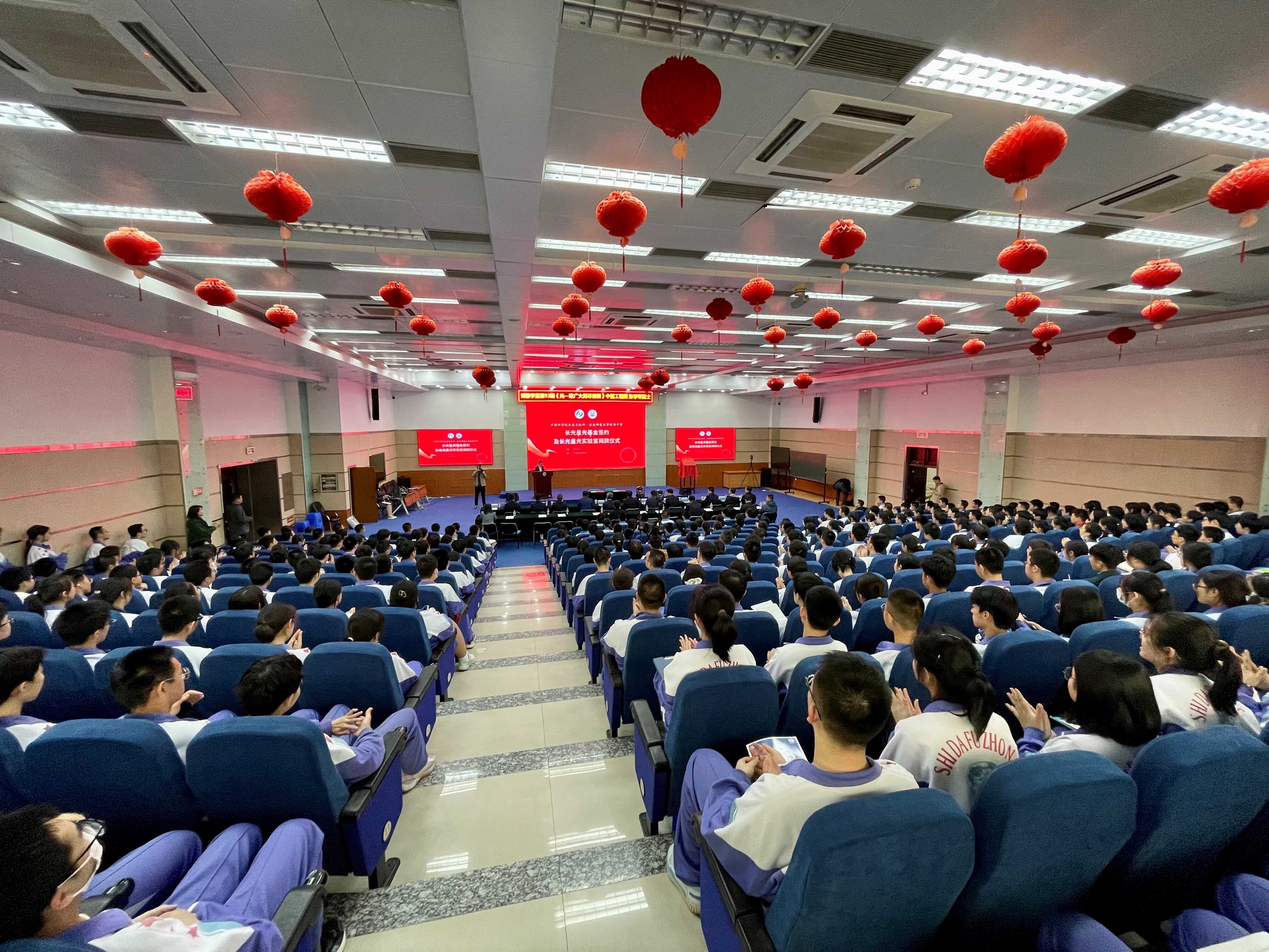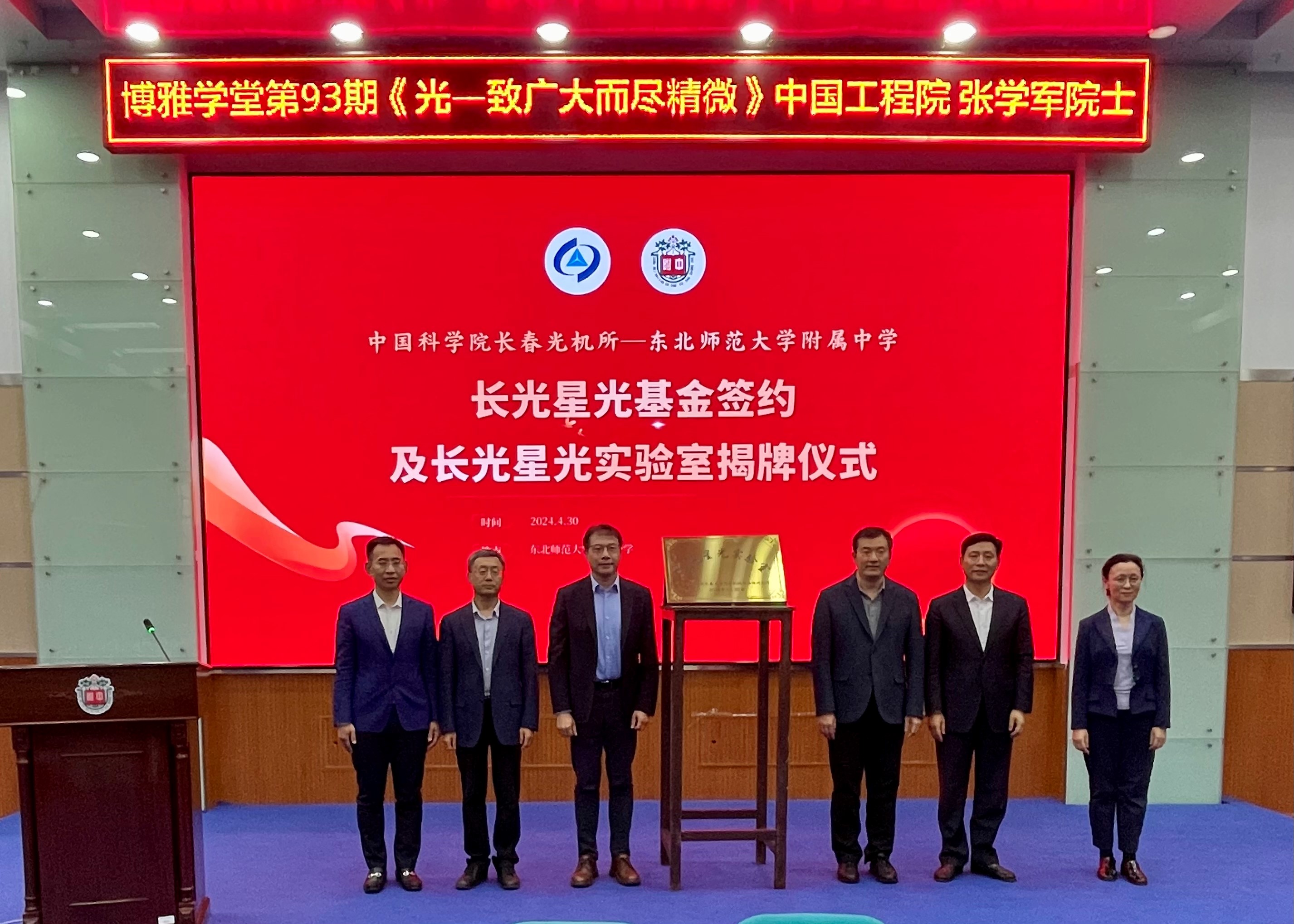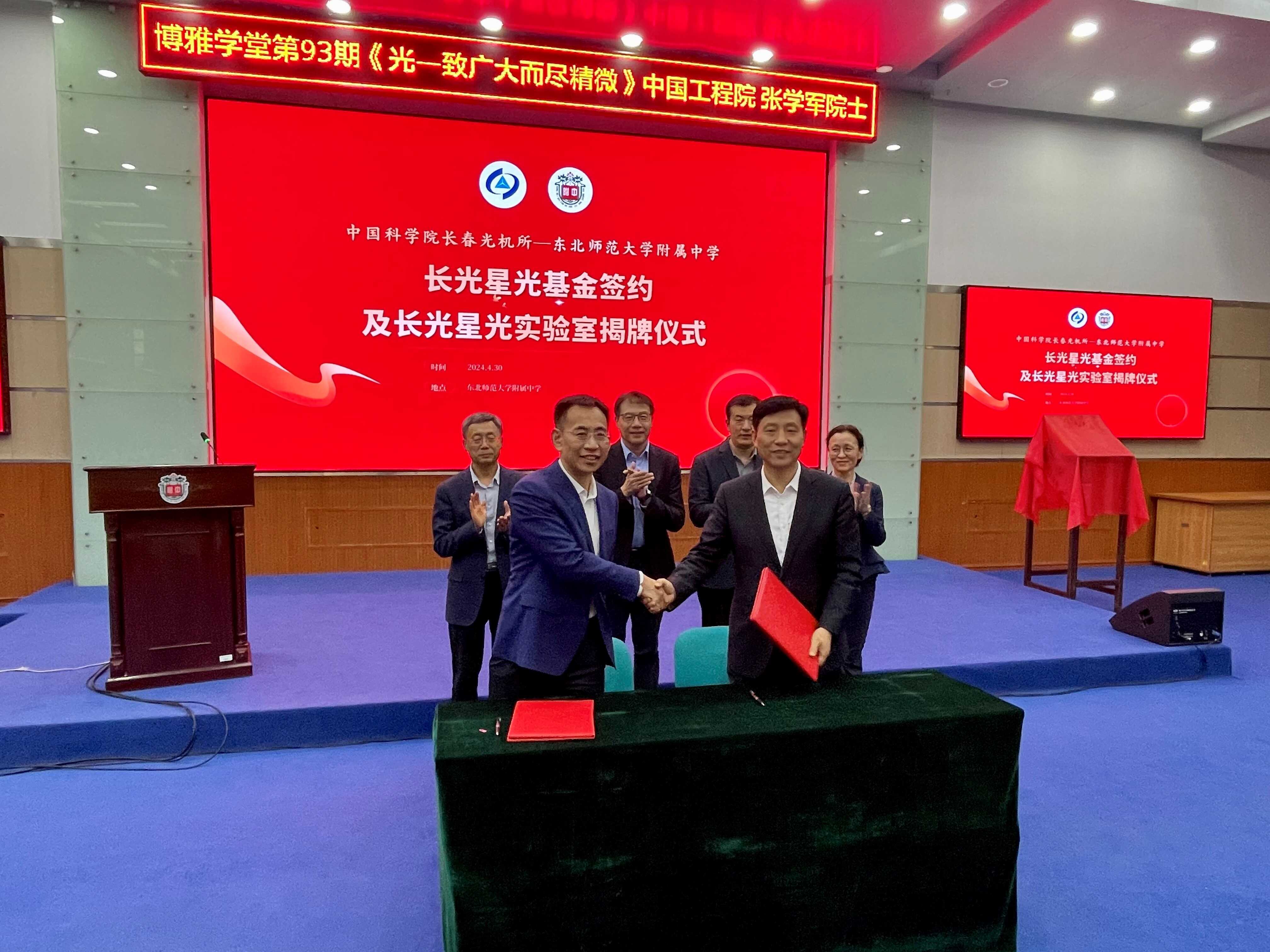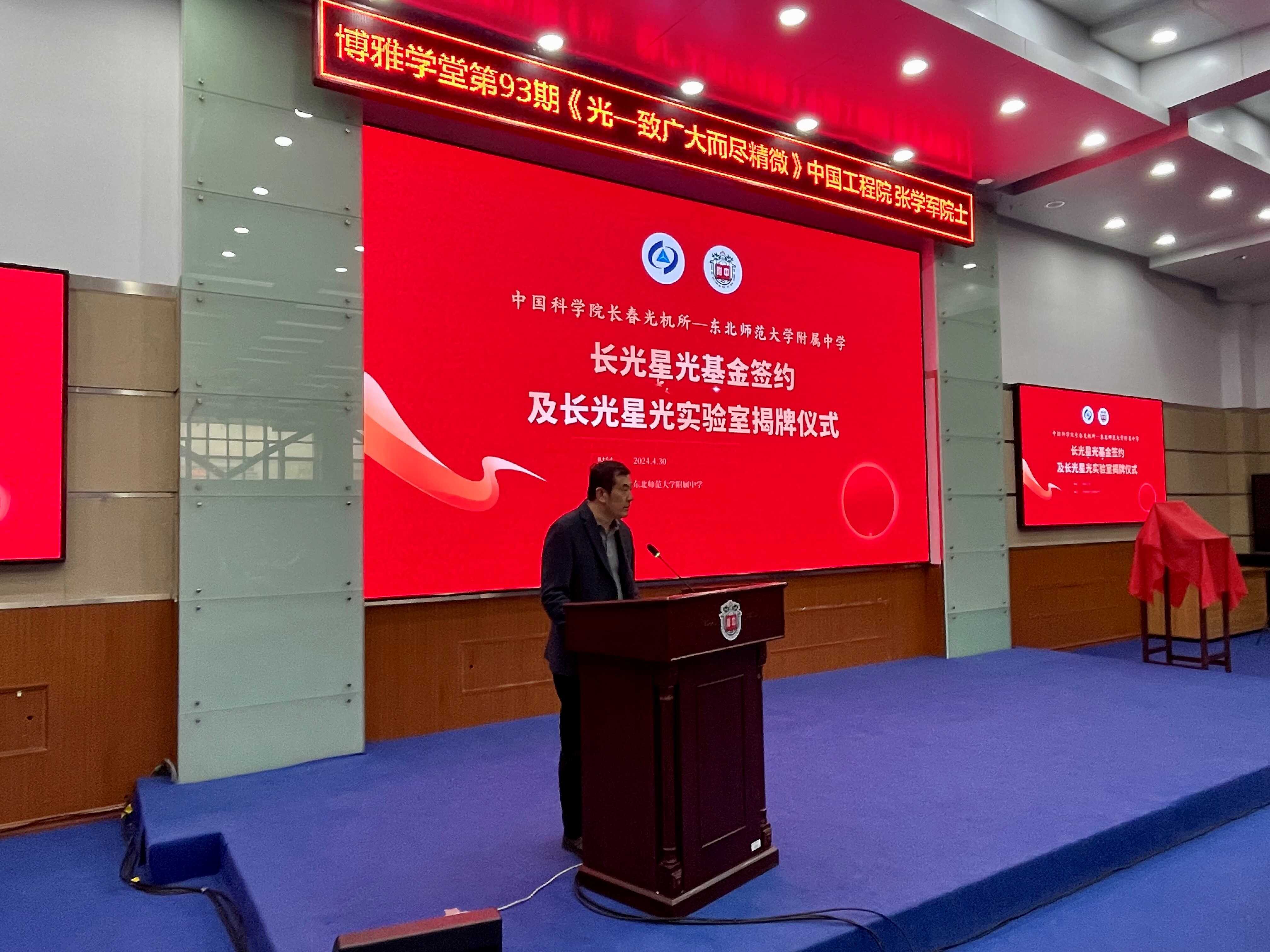 4月30日,中国科学院长春光机所与东北师范大学附属中学签约授牌仪式暨院士报告活动在东北师范大学附属中学报告厅成功举办。东北师范大学校长、党委副书记徐海阳,东北师范大学附属中学校长、党委副书记邵志豪出席并致辞,中国工程院院士、中国科学院长春光机所所长张学军讲话并作报告,中国科学院长春光机所党委副书记、纪委书记孙焕,副所长孙守红以及东北师范大学附属中学400余位师生出席本次活动,活动由东北师范大学附属中学党委书记刘丽君主持。