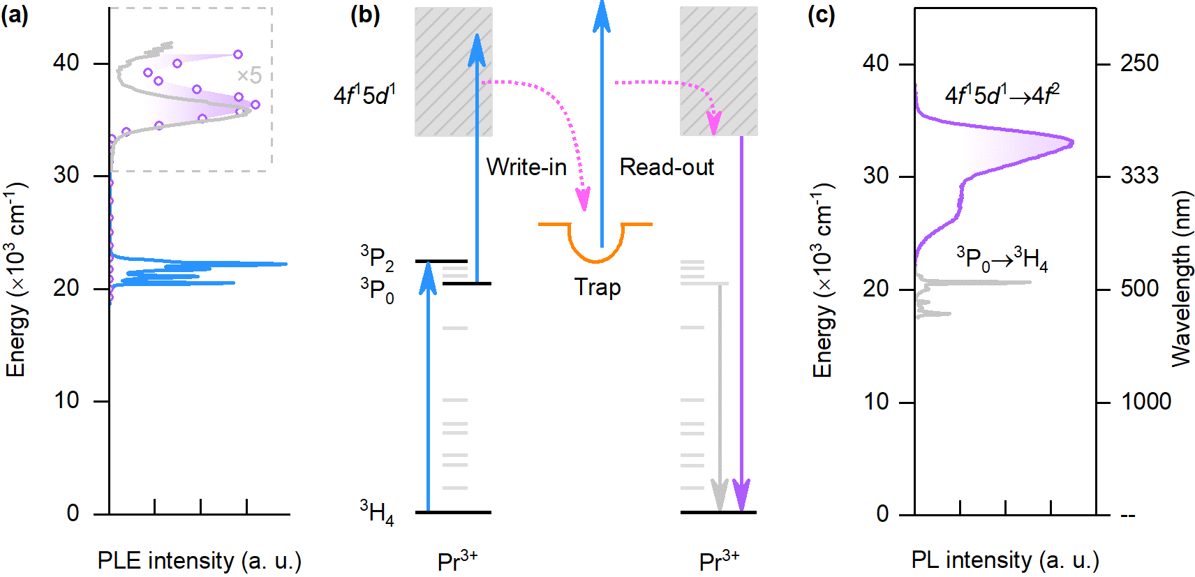 电子俘获光存储技术具有多维存储、柔性存储、纳米级存储、低功耗、环境友好等鲜明优点。该技术利用紫外光或X射线将发光中心基态电子转移到材料自身的陷阱中实现信息写入;利用陷阱对电子的俘获实现信息存储;利用红光或近红外光将陷阱中的电子激励到发光中心发出特征光信号实现信息读出。然而,分别使用短波和长波光源进行信息写入和读出导致存储器的近场结构复杂化。