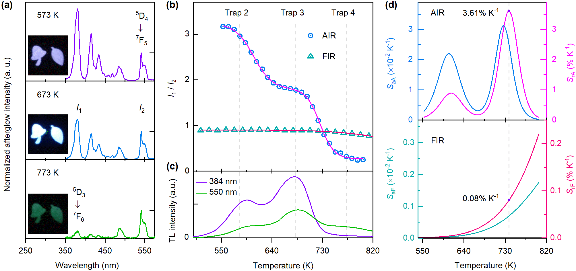 电子俘获材料的长余辉发光是一种非实时激发的发光现象,在应用时具有零激发杂散光、零背景荧光和零产热等鲜明优点。研究团队开发了系列余辉测温材料,其发射波长覆盖紫外到近红外,以匹配不同的应用场景。在Y3Al2Ga3O12:Pr3+中利用Pr3+ 4f15d1态的紫外发射带热猝灭比3P0的发射线显著,构造了最高相对灵敏度达4.12% K-1的余辉温度计[3]。在Y3Al5O12:Tb3+,Eu2+/3+中通过余辉强度比(Afterglow intensity ratio, AIR)和荧光强度比(Fluorescence intensity ratio, FIR)的差异发现陷阱与发光中心的局域关系(图3),利用该关系开发出相对灵敏度比荧光温度计高45倍的余辉温度计[2]。这一发现也为研究发光中心与陷阱的关系开辟了新的方法。