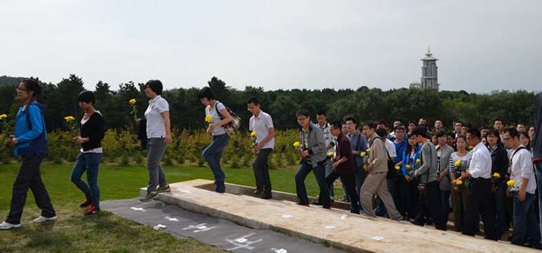参加仪式人员列队向铜像献花