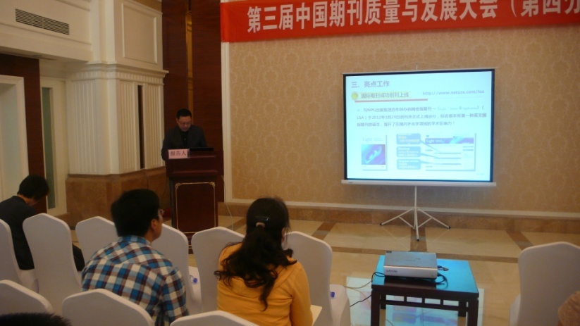 会议期间,我所编辑部代表作了题为“长春光机所办刊实践”的会议报告,详细介绍了我所主办的五种期刊,并重点推介了新刊《Light》,与会领导和代表对我所期刊给予了高度评价,并表示期刊的国际化经验对中国的期刊界具有重要意义,希望长光所再接再厉,取得更大的成绩。