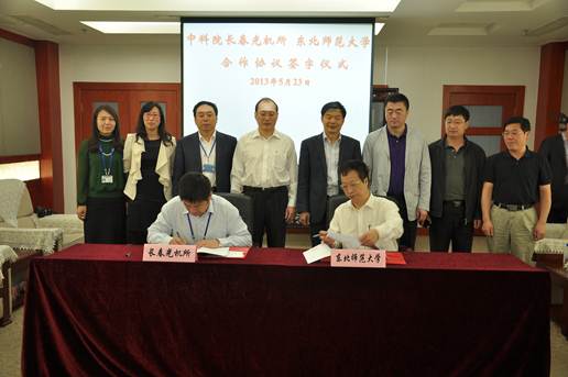 5月23日,中国科学院长春光学精密机械与物理研究所(以下简称“中科院长春光机所”)与东北师范大学协同创新合作发展协议签字仪式在中科院长春光机所举行。中科院长春光机所所长宣明和东北师范大学校长刘益春分别代表双方签署协议。中科院长春光机所副所长张涛,东北师范大学副校长苏忠民以及双方部分管理部门负责人参加了签约仪式。签字仪式由中科院长春光机所张涛主持。