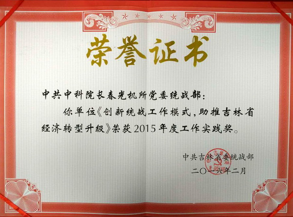 近日,吉林省统战部长会议在长春召开。会议表彰了在全省统战工作“创新实践”活动中工作业绩和实效突出的各级党委统战部,长春光机所获此殊荣。